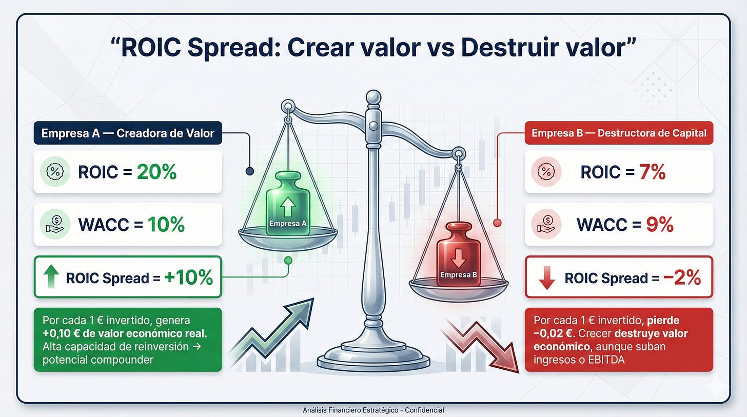 El ROIC mide cuánto beneficio operativo neto (NOPAT) genera una empresa por cada euro invertido en su negocio.