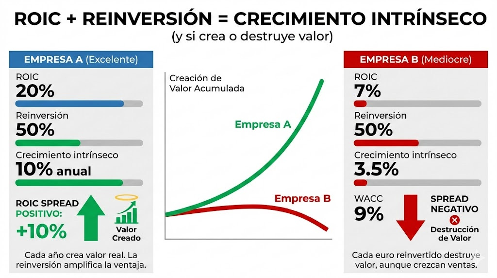 Si el ROIC es alto → reinvertir crea valor compuesto.
